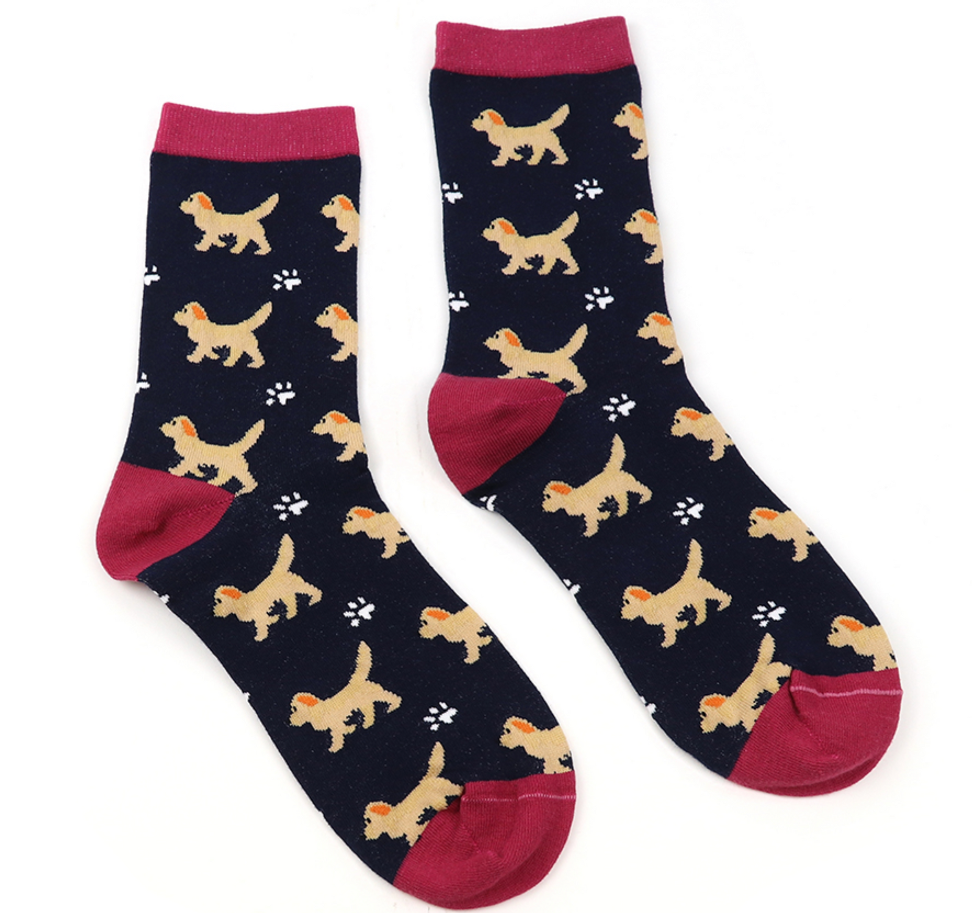 Wine and navy blue organic cotton and recycled yarn mix ankle socks with cute spaniel pattern